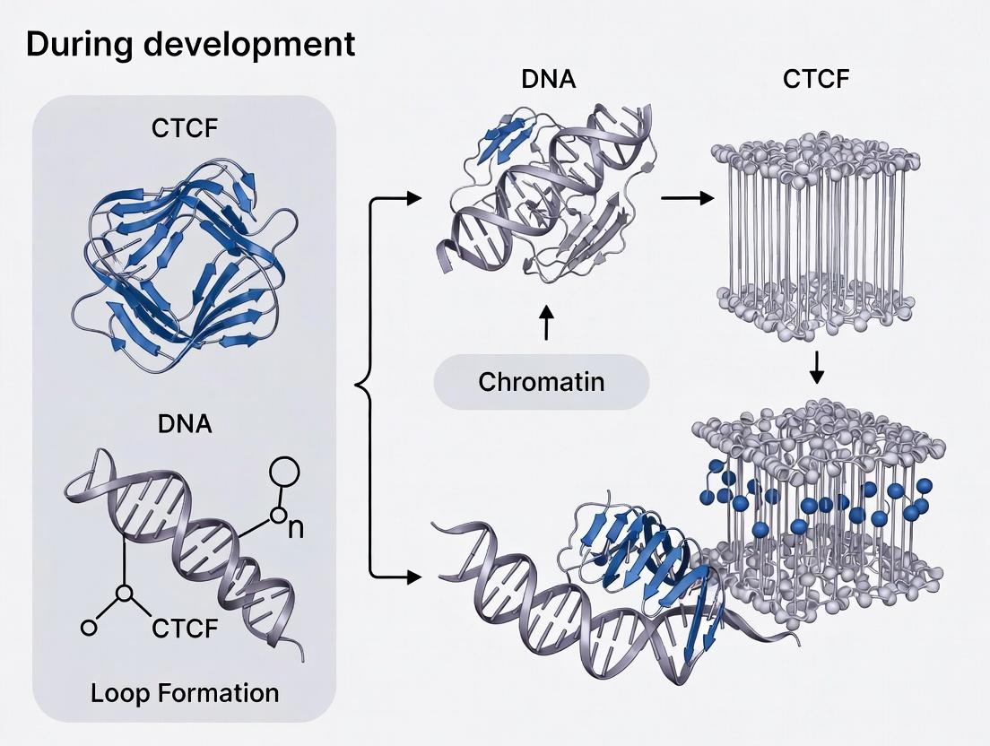 CTCF is a central architect of 3D genome organization, mediating insulator activity, loop formation, and topologically associating domain (TAD) boundaries. Its zinc finger (ZF) array binds thousands of genomic sites, with specificity determined by ZF sequence and DNA methylation status. During development, dynamic CTCF binding guides precise gene expression programs. Disruption of this finely tuned system—through either acquired somatic mutations or inherited germline variants—leads to profound pathological outcomes, exemplifying the critical importance of stable genome folding for cellular homeostasis and organismal development.