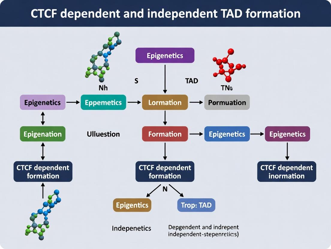 The dichotomy between CTCF-dependent and independent TAD formation reveals a nuanced, multi-layered genome architecture where both canonical and context-specific mechanisms co-exist to regulate gene expression. Foundational studies establish the loop extrusion model, while methodological advances now allow us to dissect its limits and discover alternative drivers like active transcription. Troubleshooting these experiments is critical, as misinterpretation can obscure true biological complexity. Comparative validation across systems confirms that both pathways are biologically significant, with perturbations in either linked to developmental defects and diseases like cancer. Future research must move beyond binary classification to quantitative models integrating all forces shaping 3D structure. For biomedical research, this implies a broader set of potential therapeutic targets—not just CTCF/cohesin, but the epigenetic and transcriptional machinery governing alternative folding—offering new avenues for modulating pathogenic gene programs in oncology and genetic disorders.